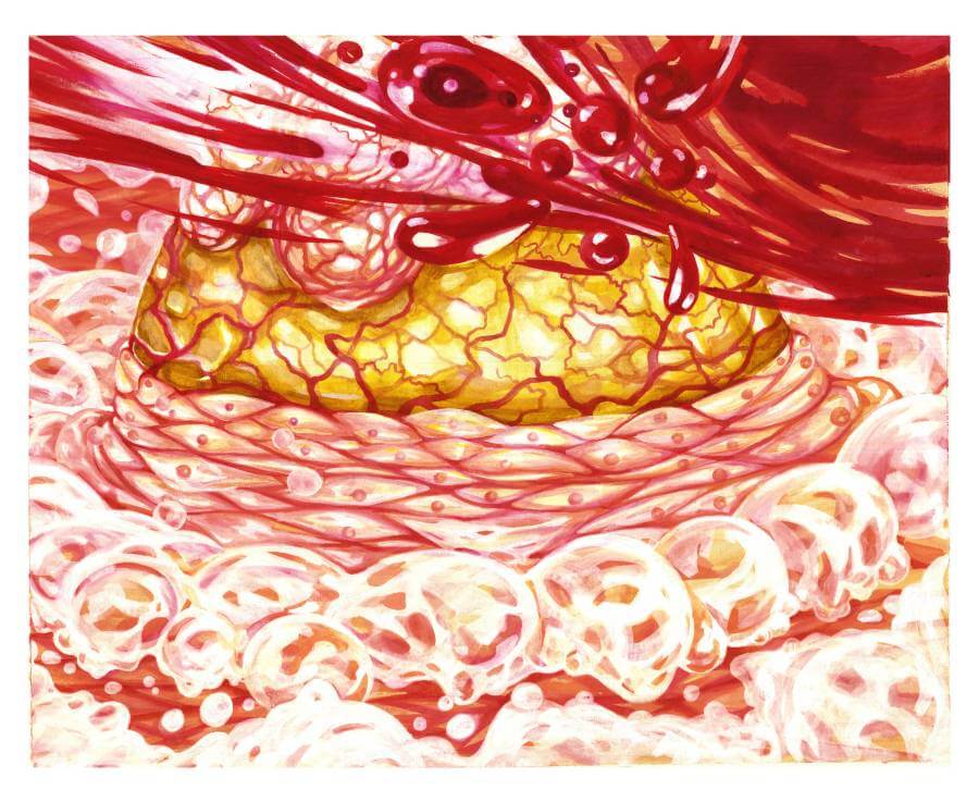 Slow Explosion is part of a series of works that focus on events and moments, exploring the psycho-emotional realm of corporeality while aiming to create new images of the body. I draw imagery and information from both the microcosm and the macrocosm in order to examine the human body and the relationship between its internal parts and external stimuli. Internal processes appear simultaneously as cosmic phenomena. An important aspect of the work is also the attempt to extend the duration of these moments. This particular painting depicts a moment of internal release and conflict.
