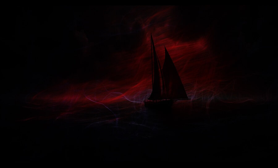 The visual environment is built upon a dynamic flow system that simulates the movement of water and air, creating a constantly shifting imagery. A dramatic palette of red, blue, and purple tones enhances the emotional intensity, immersing the viewer in a "digital sea" where the sailing vessel serves as a focal point within the flow.